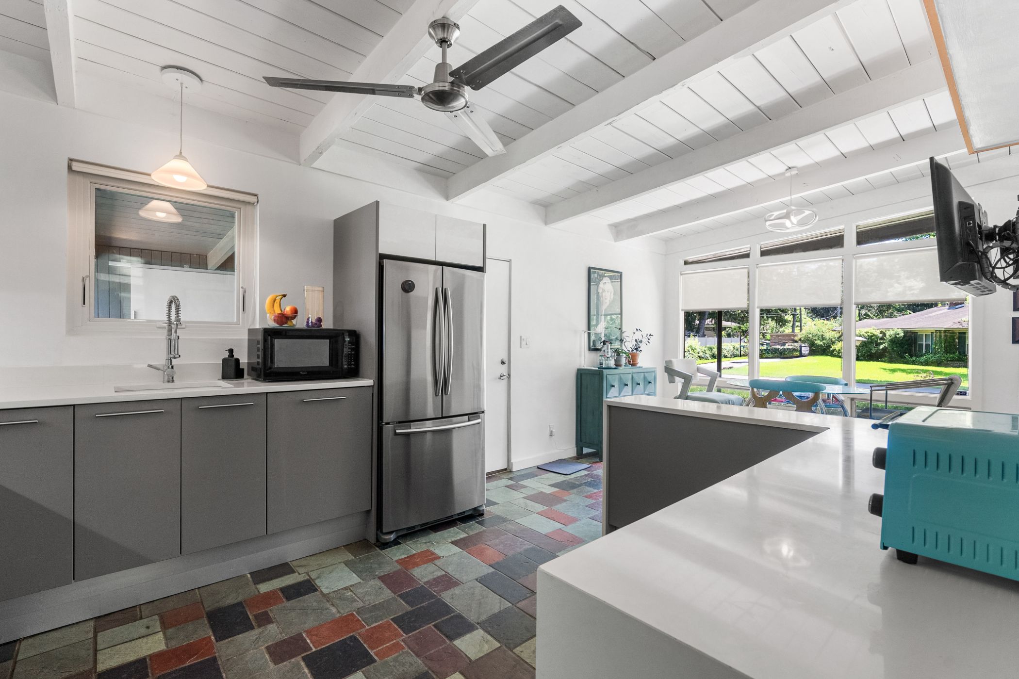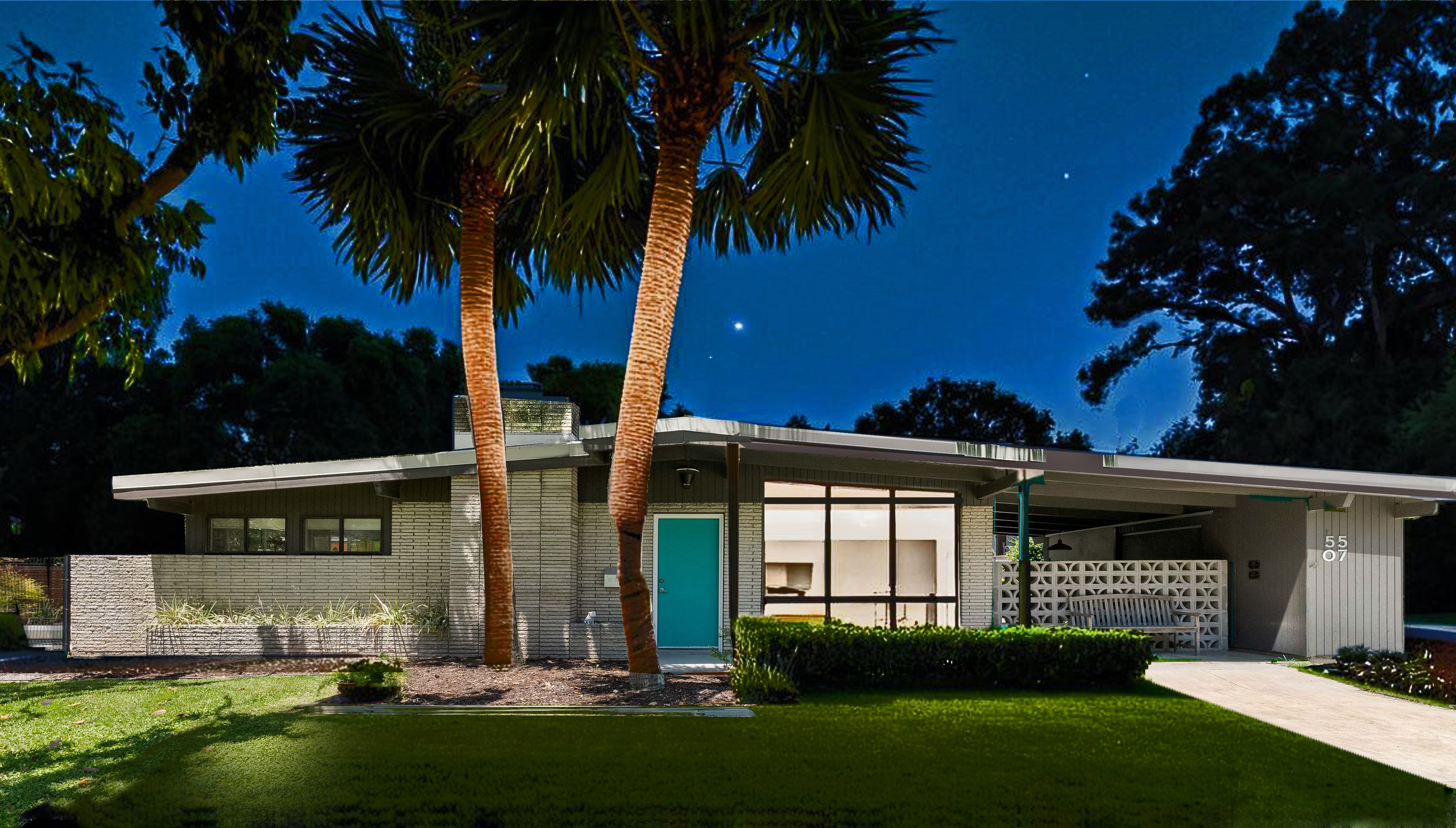 A clean and crisp design makes this award-winning Mid-Century Modern property a dazzling retreat. Designed in 1954 by architect-builder John Ahern and elegantly restored by a nationally published team, this minimalist structure overlooks a park brimming with natural oak and pine trees draped in Spanish moss and complete with the fragrance of magnolia and jasmine.